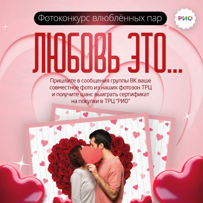 Присылайте в сообщения группы ВК фото своей пары из фотозон ТРЦ до 15 февраля включительно.